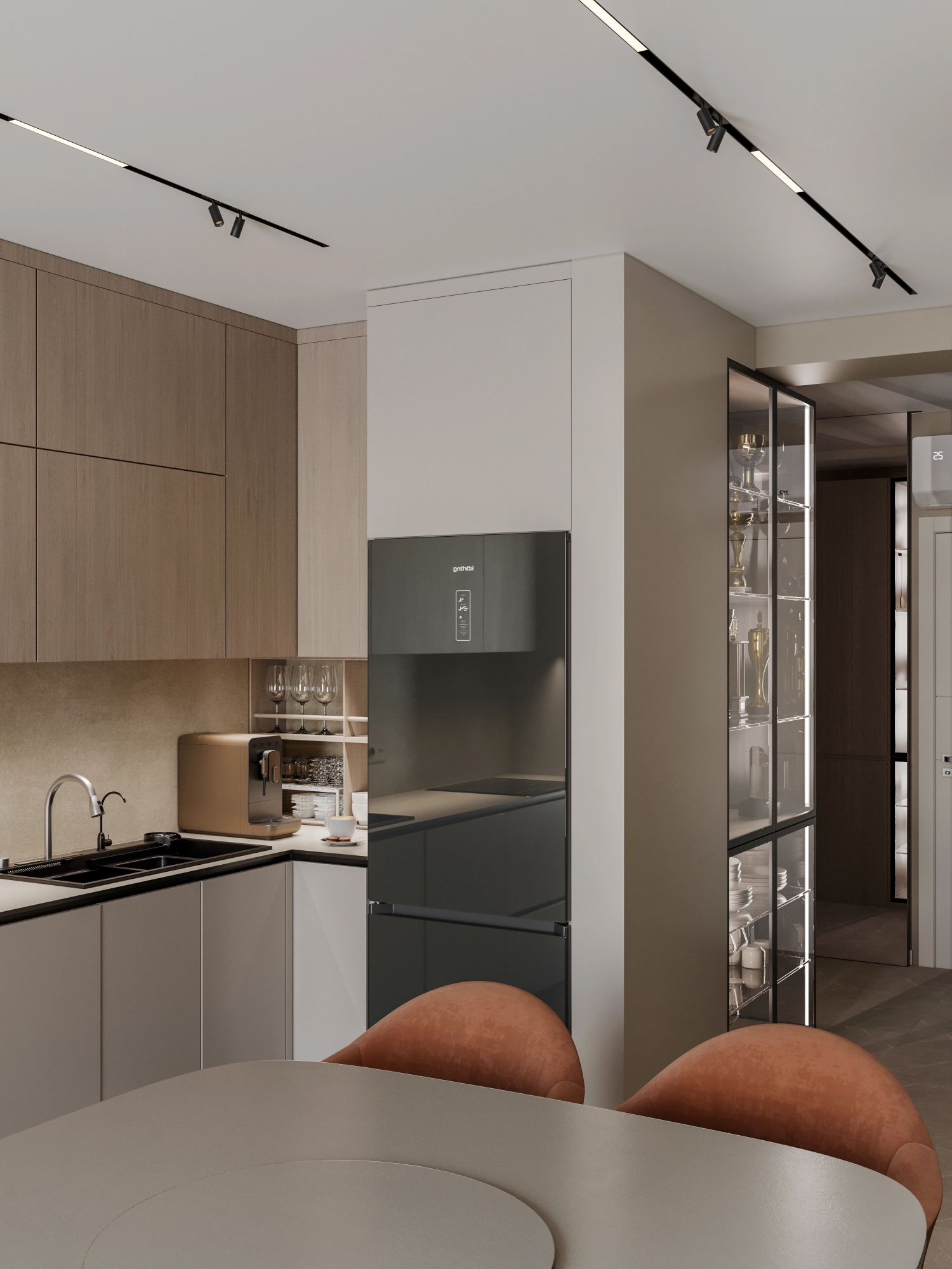 Interiorul apartamentului este o expresie a stilului contemporan cu influențe de lux, caracterizat de linii curate, texturi naturale și o utilizare inteligentă a materialelor premium, cum ar fi marmura. Elementele integrate sunt bine echilibrate, punând accent pe eleganță și funcționalitate. Spațiul reușește să fie atât practic, cât și estetic, cu un design sofisticat și detalii rafinate. Tonuri calde și naturale, dominate de nuanțe de crem, bej, maro și accente aurii ale marmurei. Contraste subtile între texturile mate ale lemnului și suprafața lucioasă a marmurei.