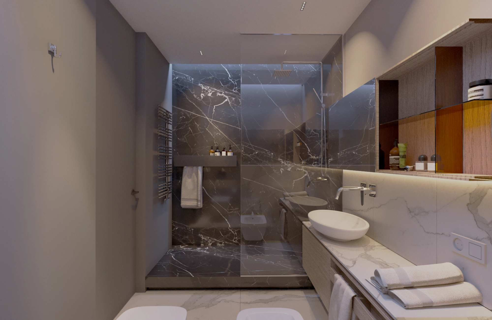 Acest spațiu este amenajat într-un stil modern, cu influențe minimaliste, reflectând o atenție deosebită la detalii și la echilibrul dintre funcționalitate și estetică. Spațiul este dominat de tonuri neutre – gri, bej și alb – care creează o atmosferă calmă și sofisticată.