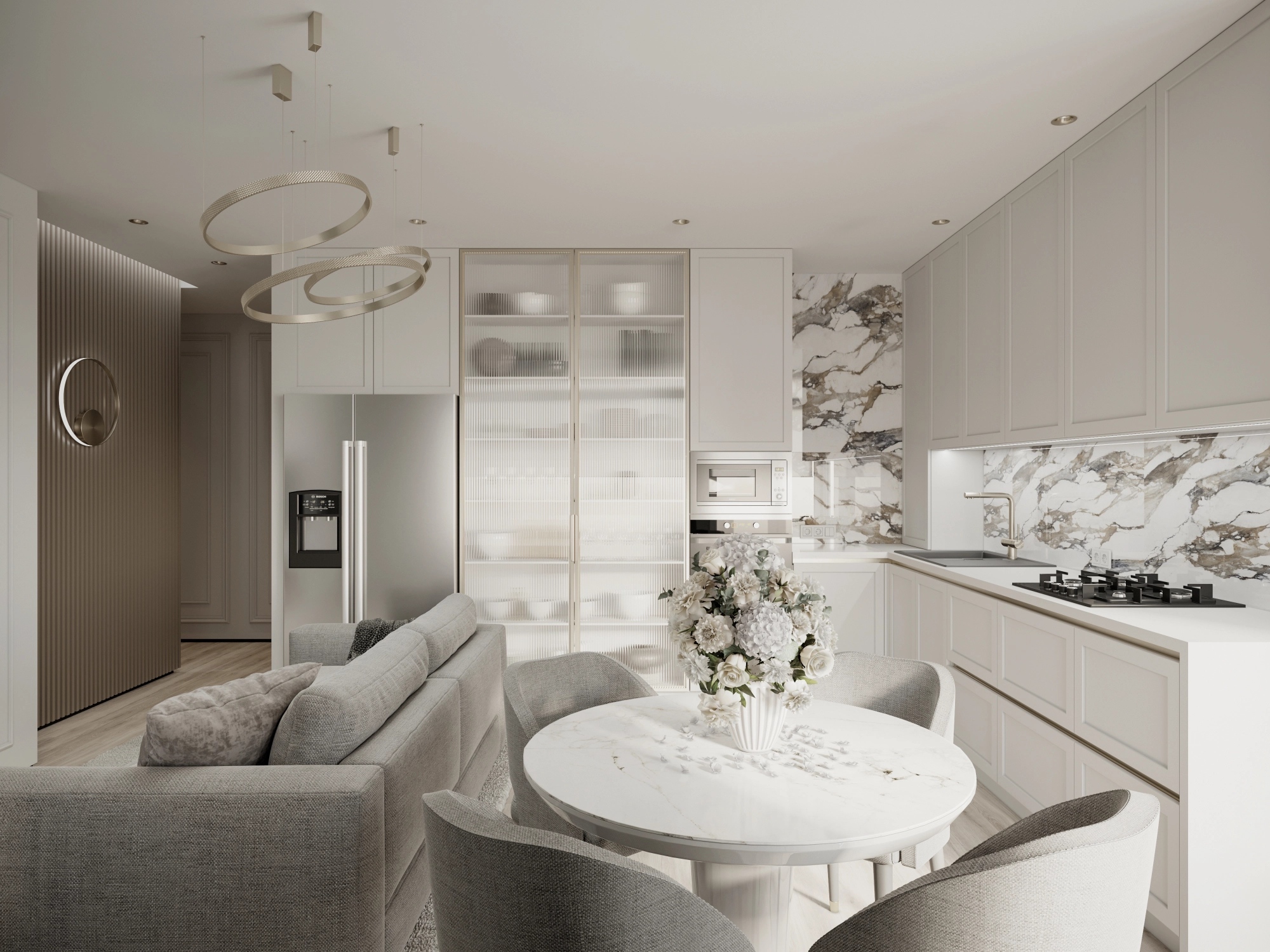 Paleta de culori este neutră și elegantă, dominată de tonuri de gri, alb și bej, cu accente aurii și venele marmurei, care adaugă dinamism. Contrastul subtil între suprafețele mate și lucioase intensifică armonia vizuală.