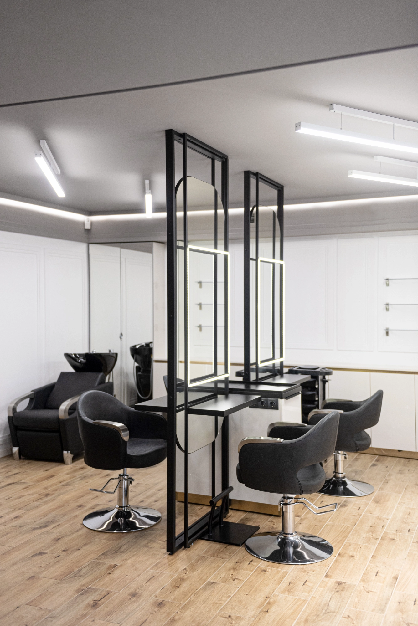 Представляем вашему вниманию проект, способствующий успеху и замечанию салона красоты, расположенного в центре города. Площадь салона пропорционально разделена на два уровня. На первом этаже находится зона ожидания, ресепшн и парикмахерская зона, наверху — маникюрный, педикюрный и изолированная зона для косметологических процедур. Салон был выбран в современном стиле с классическим декором, модернизированным благодаря фасадам в классическом стиле, отделке потолка и стен, включая скрытое освещение для лучшего освещения и разграничения зон. После двух лет работы в салоне сохранилась та же свежая атмосфера и комфортное пространство. Задача проекта заключалась в двухмесячном сроке на проектирование и реализацию, к которому добавилось еще и состояние пандемии. Заказчик хотел получить хорошо организованный салон с удобным доступом ко всем зонам и непринужденной и простой атмосферой для клиентов и сотрудников салона. Доминирующими материалами, подчеркивающими интерьер, стали металл и черное стекло. Внутри куба из закаленного стекла черного цвета на втором уровне находится зона для косметологических процедур. Мы выбрали это стекло не только для доминирующего вида внутри, но и функционально, чтобы создать интимную атмосферу для тех, кто находится внутри.